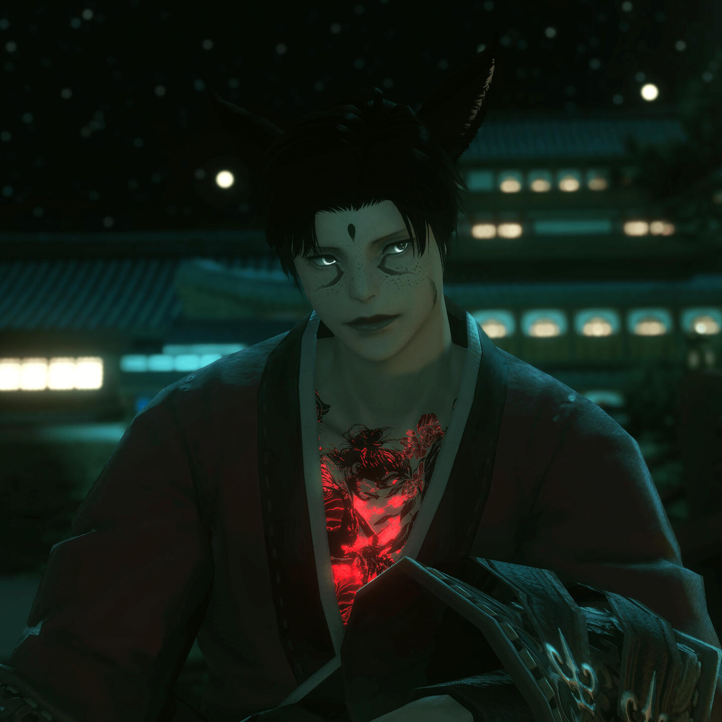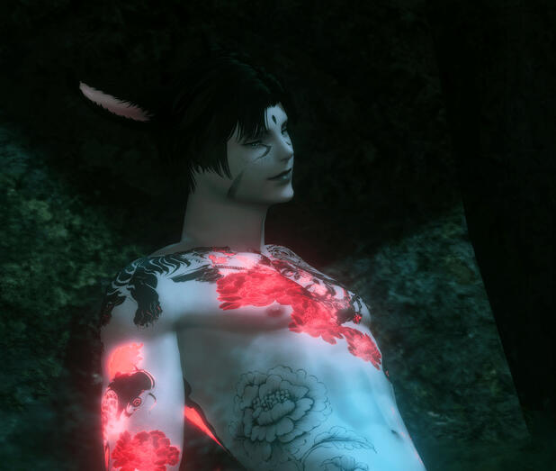 • markings : traditional Miqo'te clan marks on his undereye and cheek area ; upside-down black teardrop on the forehead